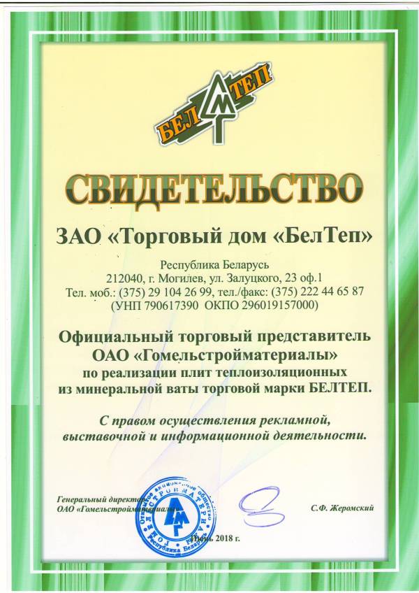 ЗАО "Торговый дом "БелТеп" – официальный торговый представитель ОАО "Гомельстройматериалы" на территории Республики Беларусь.